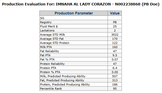 - 1-0 296 1564 78 67 (in progress); last test day 4.5# milk @ 6.4% fat & 4.7% protein